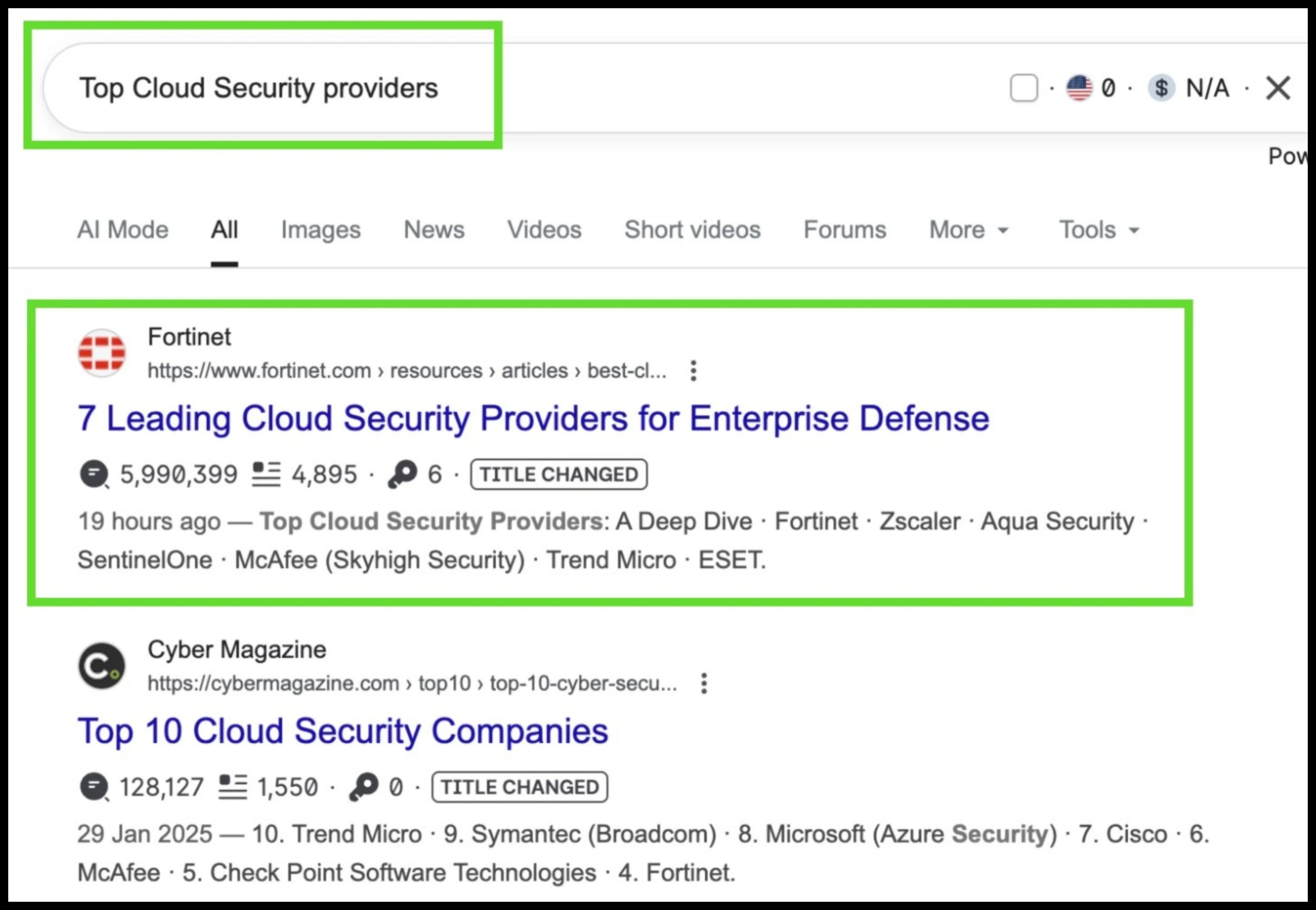 The situation intensified when content monitoring detected two new competitor listicles claiming "top cloud security providers" status—neither mentioned Fortinet:
