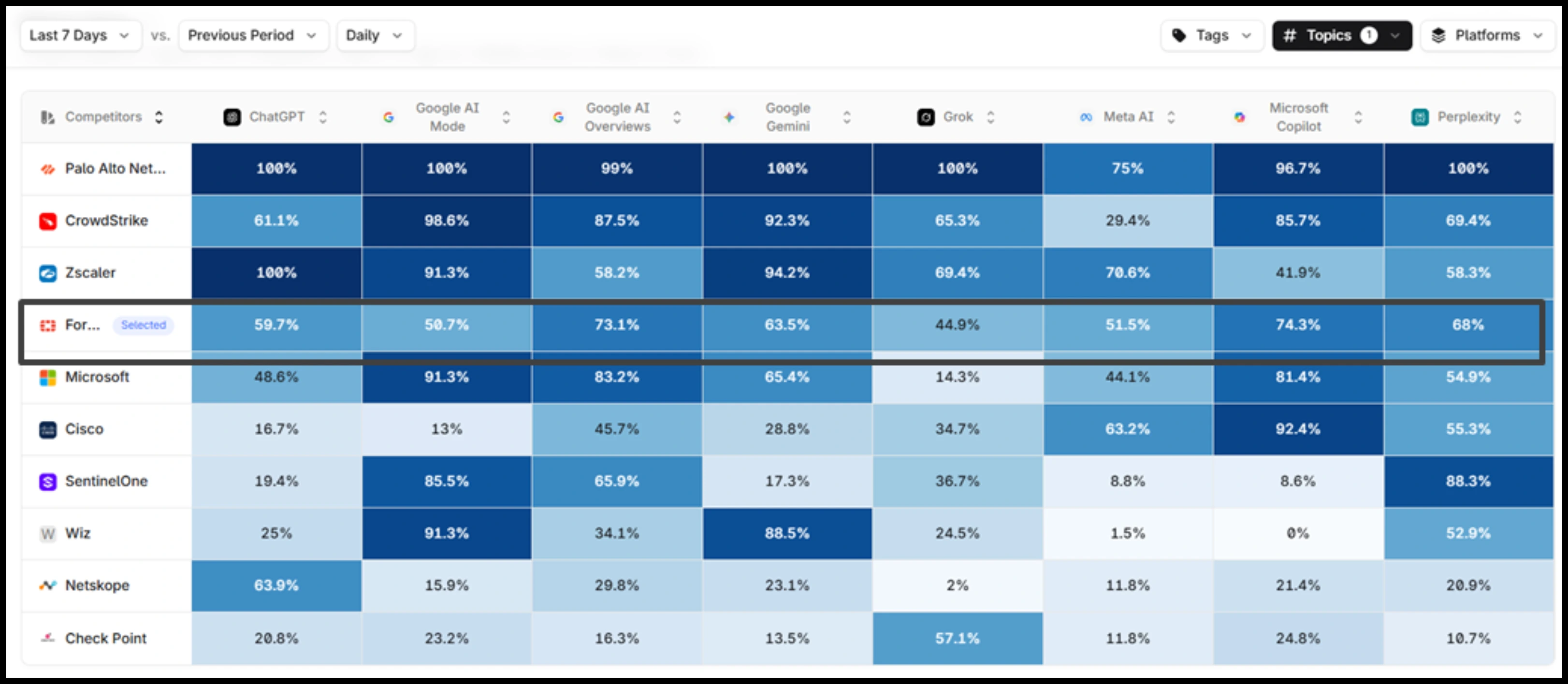 - 78.9% of all citations came from earned media sources where Fortinet had minimal presence