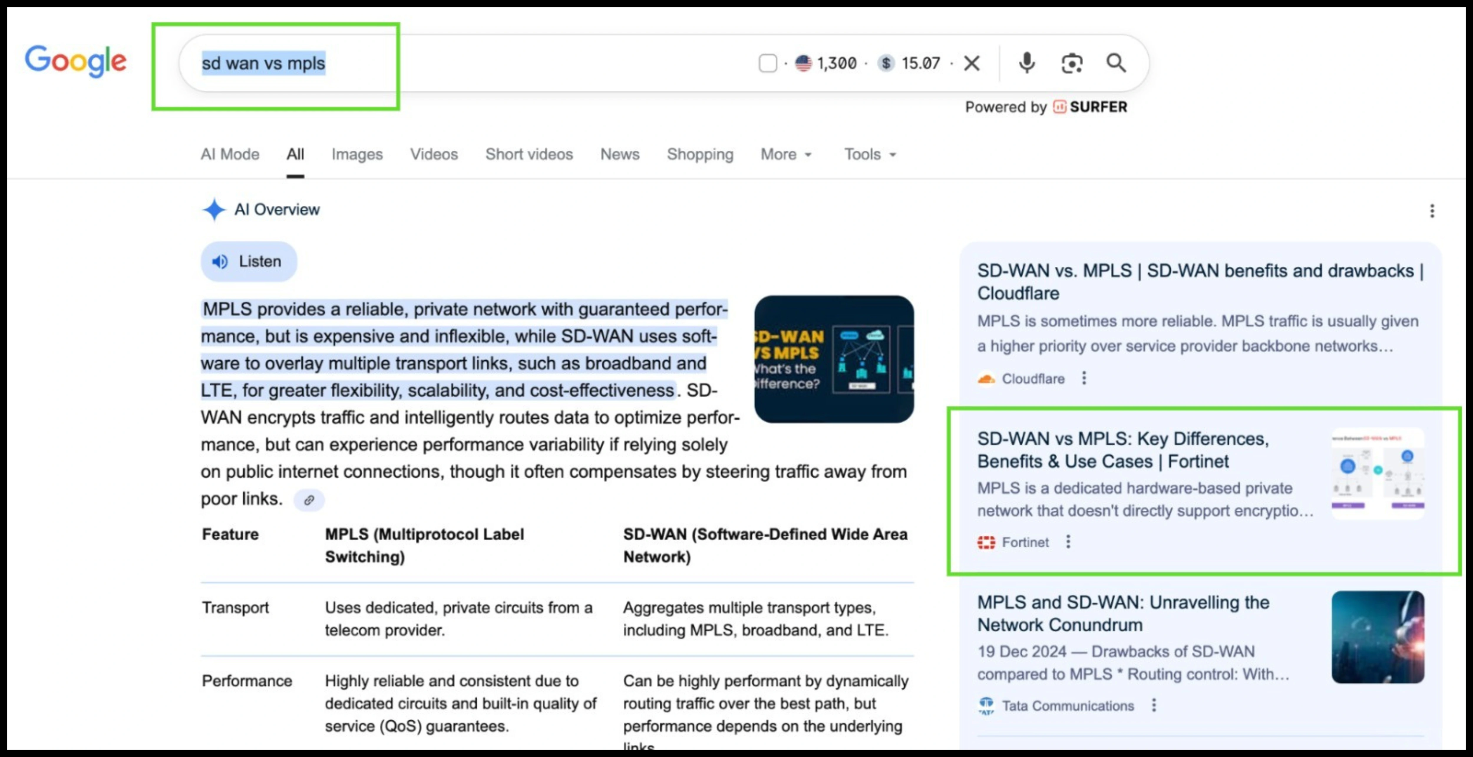 Challenge: Despite being a comprehensive resource, the SD-WAN vs MPLS comparison page was completely invisible in Google AI Overviews and ChatGPT responses.