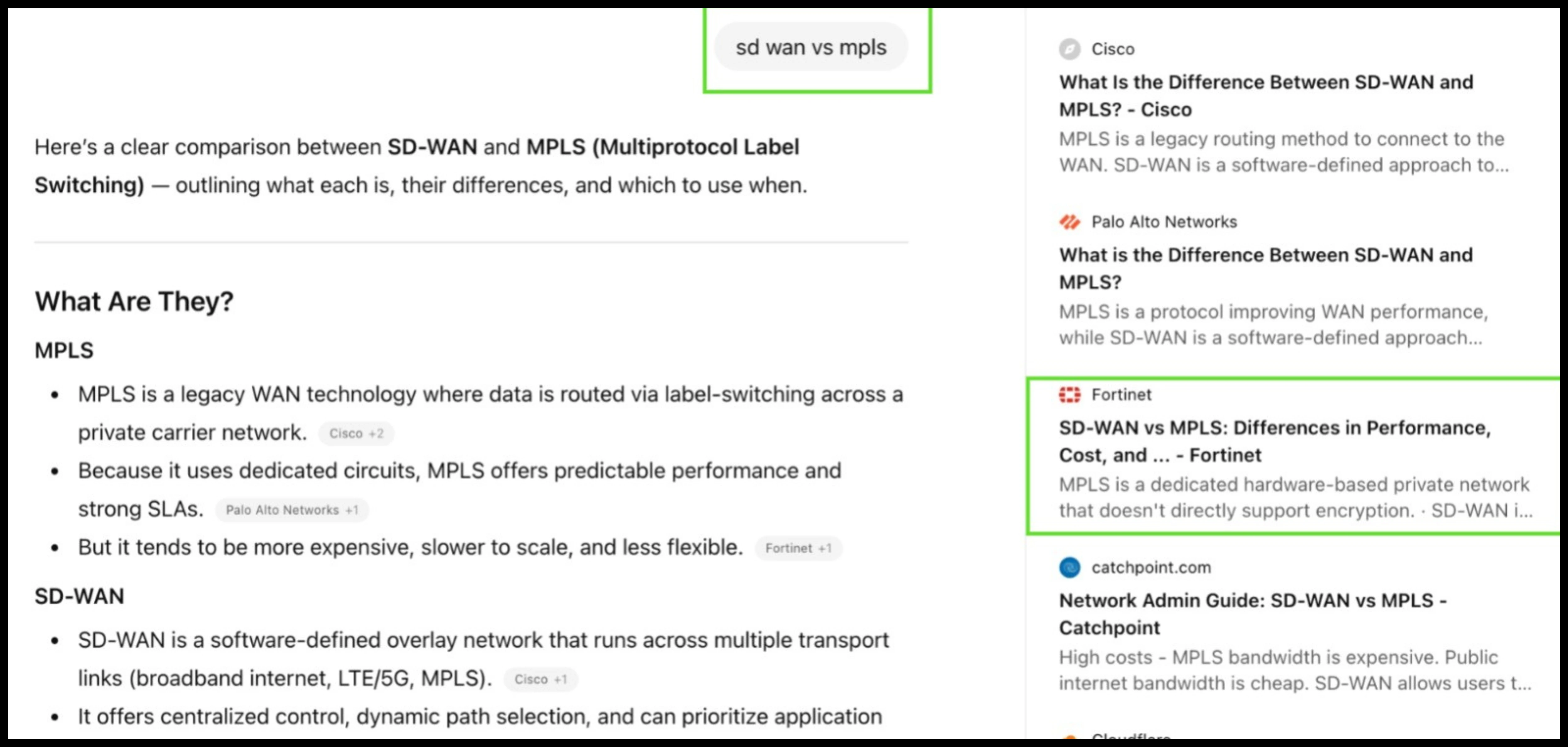Despite having comprehensive, well-researched pages like the SD-WAN vs MPLS comparison, these resources were completely invisible in AI-powered search results. The challenge wasn't content quality—it was content structure. LLMs weren't recognizing or citing existing Fortinet content because it lacked the specific formatting, schema markup, and conversational frameworks that AI models prioritize.