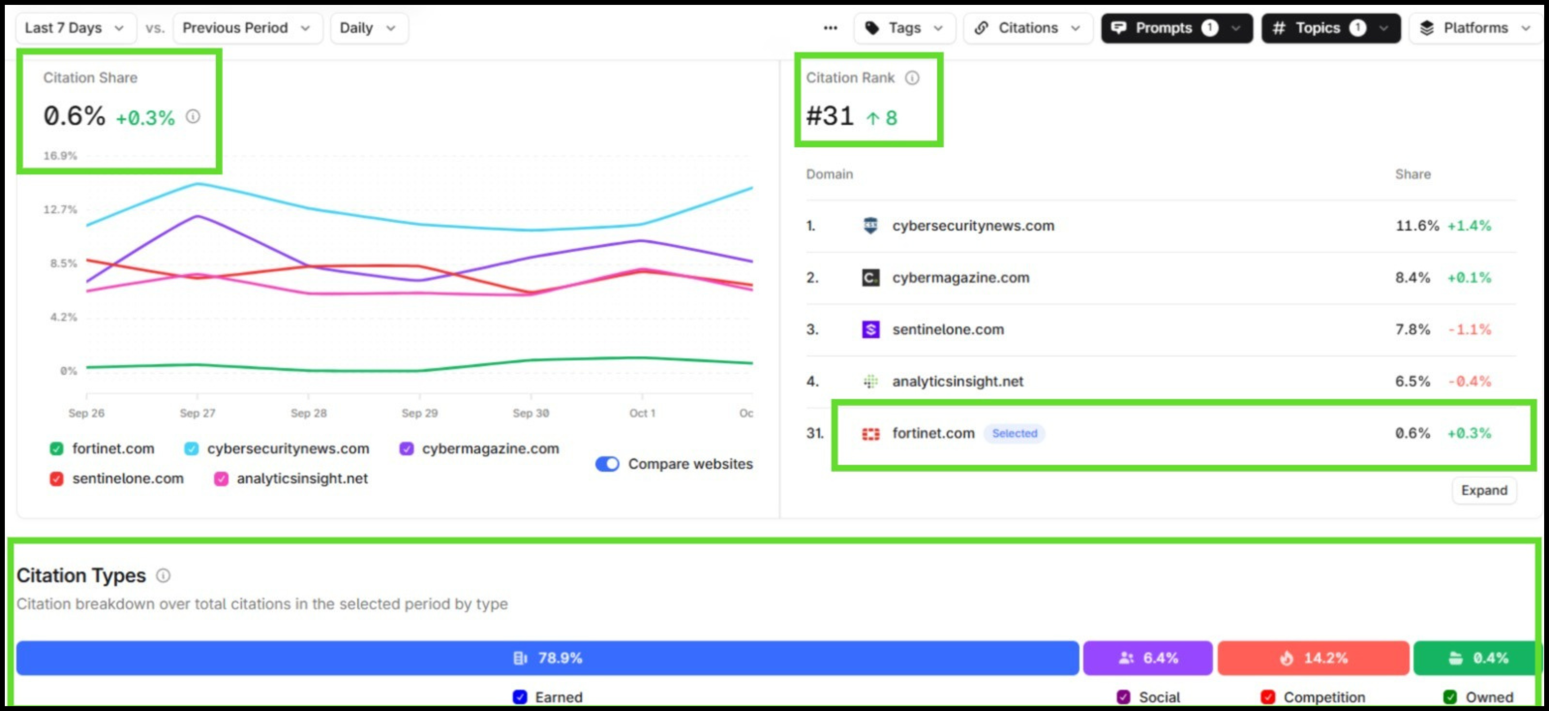 Profound analysis shows that 78.9% of all citations in the Cloud Security category come from earned media, with Fortinet capturing only 0.6% citation share — far lower than Palo Alto Networks, CrowdStrike, and Zscaler.